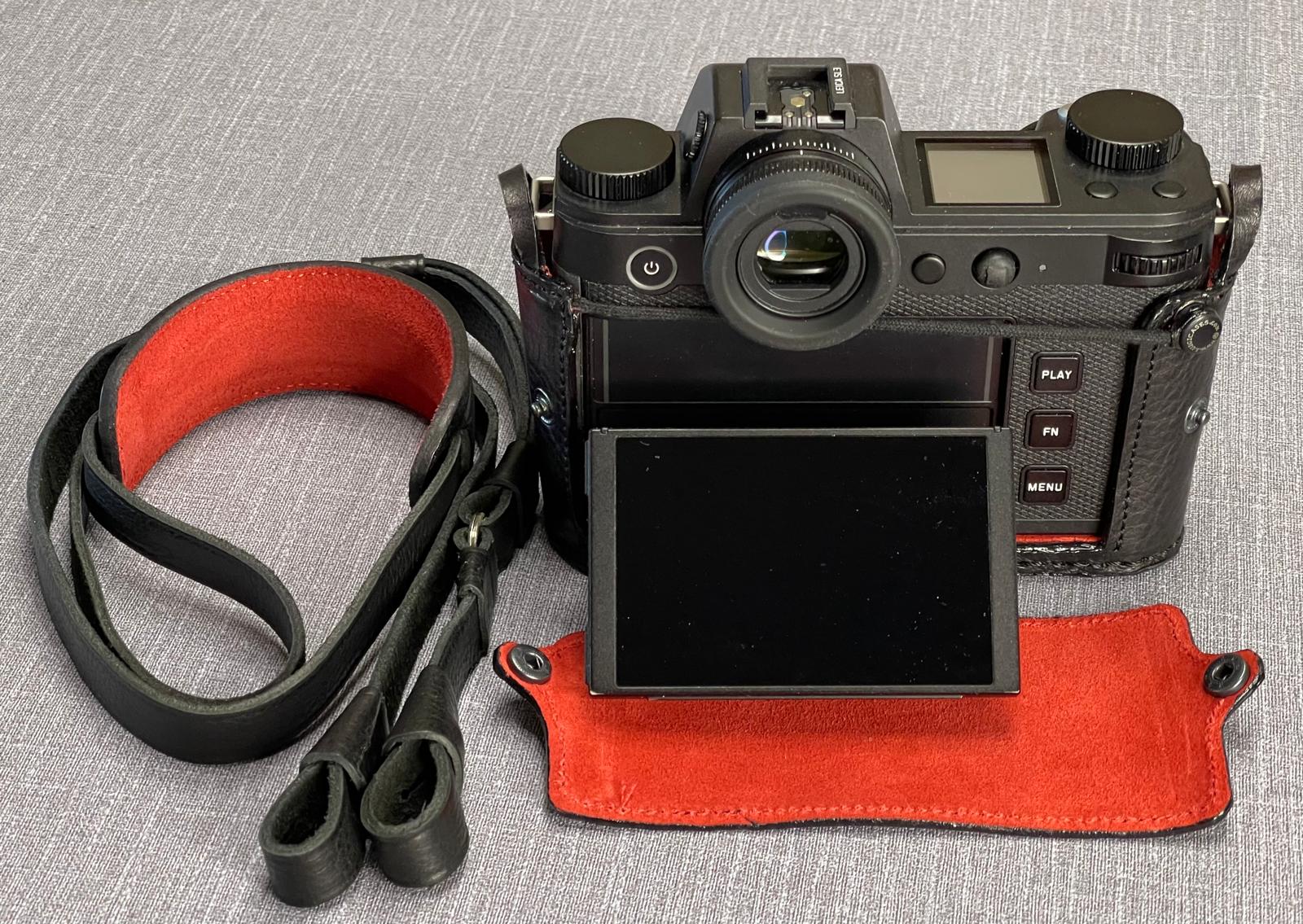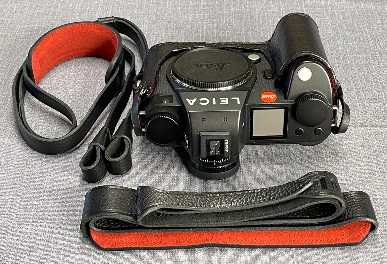 A Black + red stitches half case for Leica S2, S007, S007 with